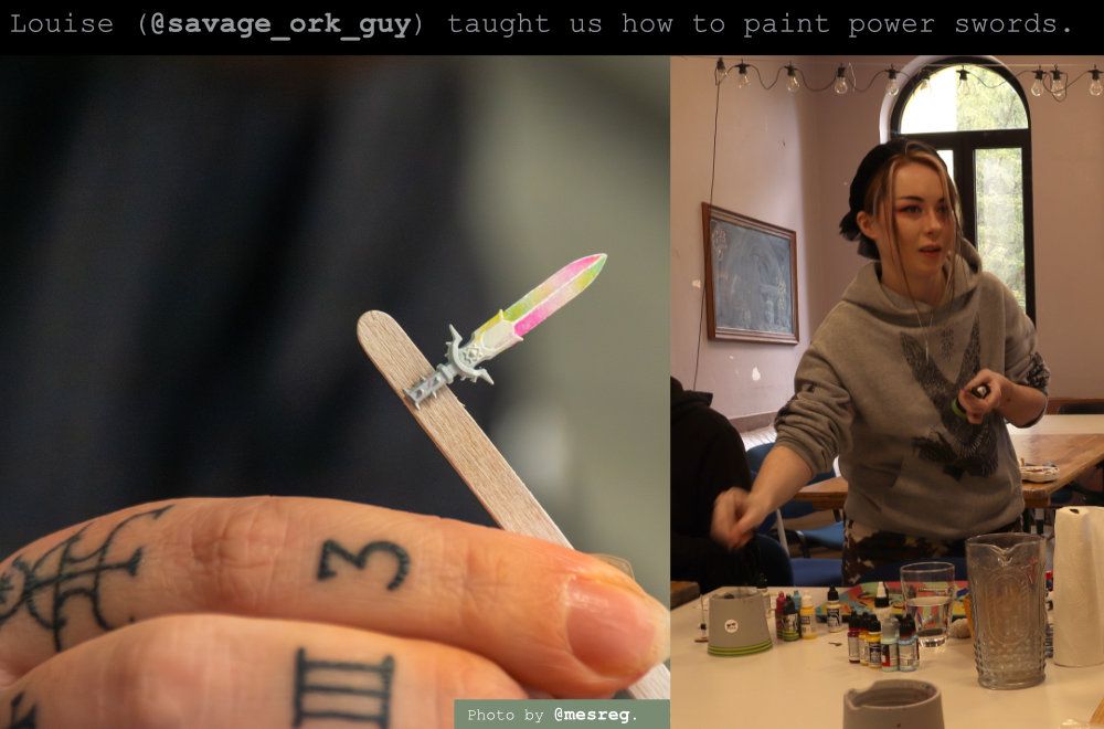 Everyone got to attend up to two workshops over the course of the weekend. The first workshop on Saturday was Creativity in Theory with Veronica (@florescentia.grotesque). I peeked a bit and it looked super intriguing. But I wasn’t in that one; my first workshop was later that day: Louise Sudgen’s (@savage_ork_guy) about Prismatic Sword Painting.