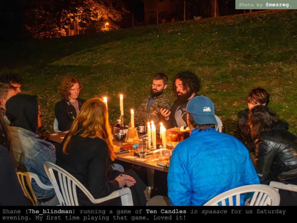 That evening I was invited by Shane (7he_blindman) to play Ten Candles. It’s an indie TTRPG described as tragic horror - all the characters are doomed from the start. The story that plays out is a record of their final hours. There are no dice involved, and the mechanics include burning parts of the character sheet and a bunch of drippy candles. We played in the backyard at night. It was fantastic, and then we died. Big thanks to the GM and the rest of the spaceship crew who perished in the void with me: @atelier.ag, @elilenti.art, @blightbones, @_catharthegreat, @florescentia.grotesque, @martin.mccoy.art, @photosandramblings.