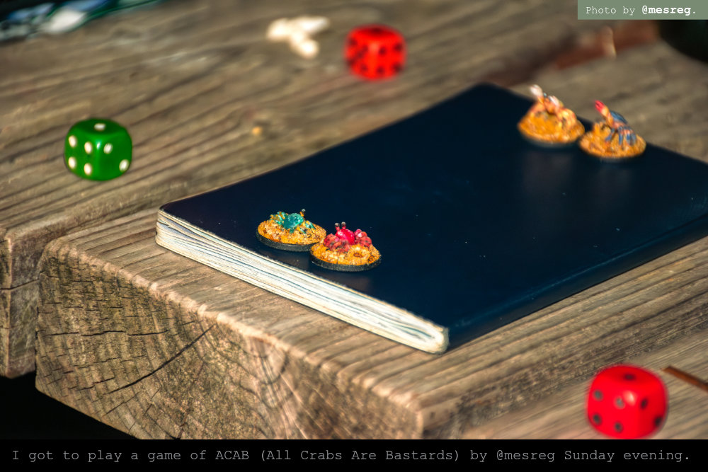 There were other games as well as storytelling going on in the meantime in other parts of the manor, but sadly one can’t be in multiple places at once. Apart from Ten Candles I got to play two more games over the course of the weekend: ACAB (All Crabs Are Bastards) by Daan (@mesreg) and Bird God 28 by Martin McCoy. Both games are nice and silly, demanding very little brain power (which worked for my sleep-deprived, beer-soaked grey matter). Coincidentally, both use a version of rock-paper-scissors for combat.