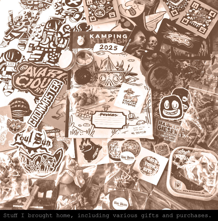People brought stuff to sell, so I shopped a bit. I also received a bunch of stuff as gifts, and a pile of new stickers for my growing collection. Probably my favourite thing I was given was a hand drawn artwork of Nekroplanet Raiders by Gabriele Cardosi, whose tattoo work I‘ve been admiring for a while.